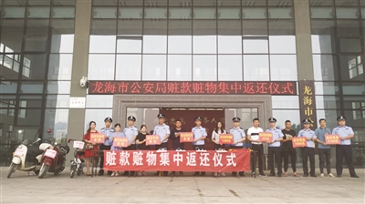 漳州新闻网讯(吴渊杰文/图)10月11日,龙海市公安局举行赃款赃物集中返还仪式,将近期警方破案追回的钱、电动车、手机等财物返还给受害群众。